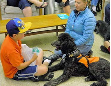 Maya is a beautiful and sweet-natured goldendoodle who is half golden retriever and half standard poodle. Maya is a big dog, about 68 pounds — and produces kind, gentle and intuitive puppies suitable for all types of therapy and service work. Maya is low-energy and her puppies tent to also be low energy. Her size and demeanor have given us some outstanding mobility assistance and emotional support service dogs.